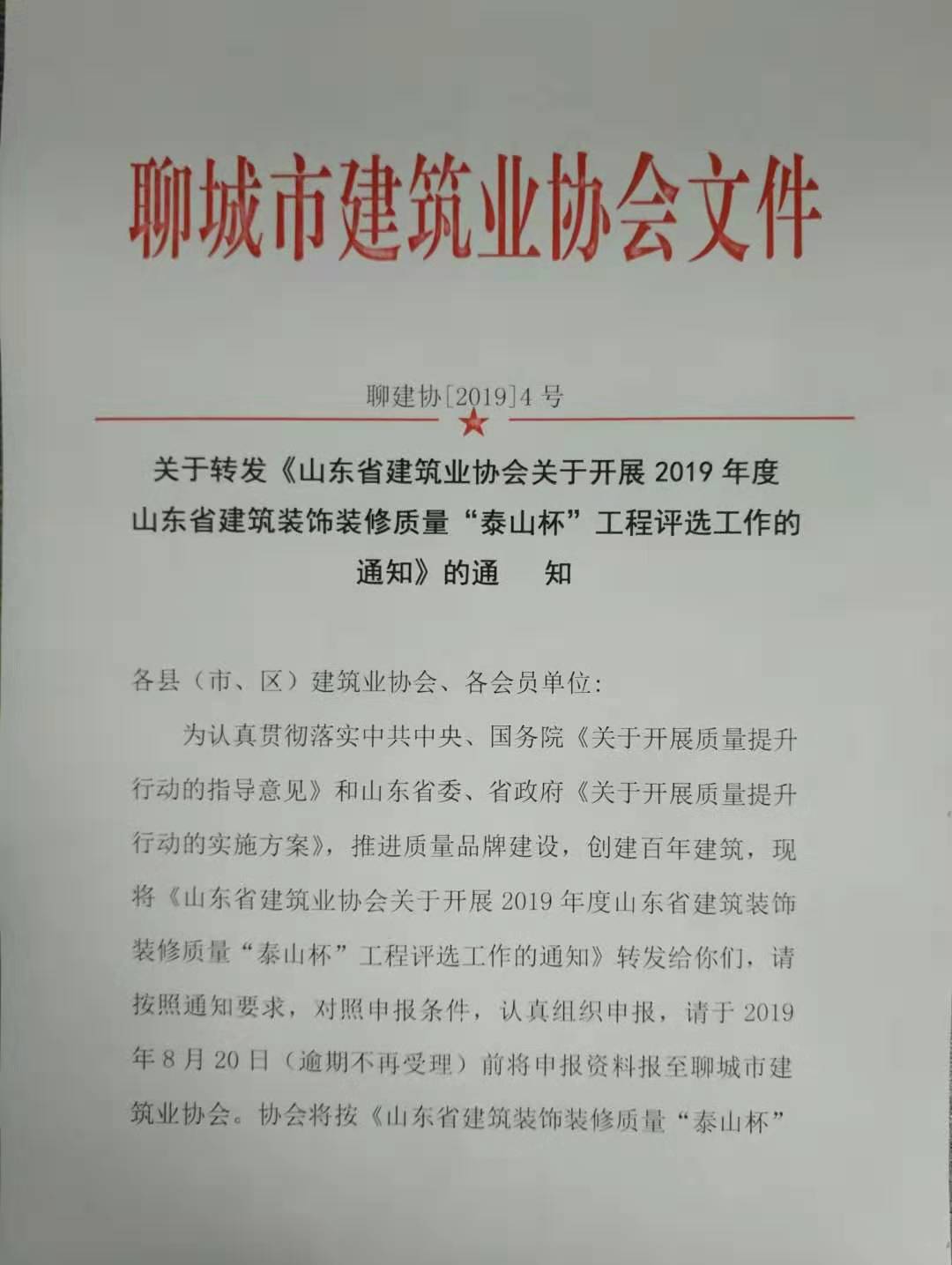 關(guān)于轉(zhuǎn)發(fā)《山東省建筑業(yè)協(xié)會關(guān)于開展2019年度山東省建筑裝飾裝修 質(zhì)量“泰山杯”工程評選工作的通知》的通知