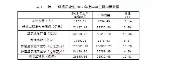 住房和城鄉(xiāng)建設部匯總的6552個特、一級資質建筑業(yè)企業(yè)2019年上半年主要指標數(shù)據(jù)如下(表1)。